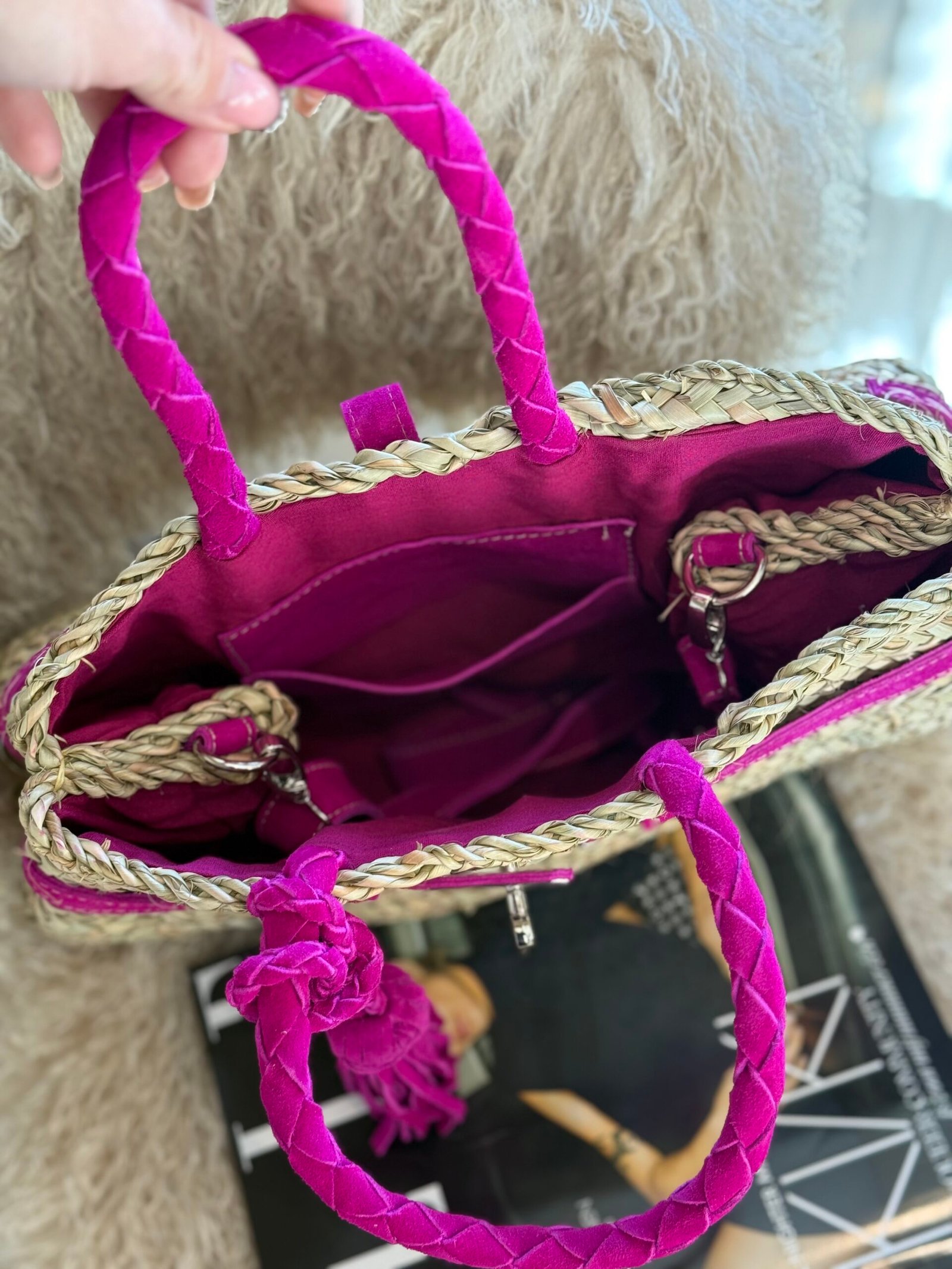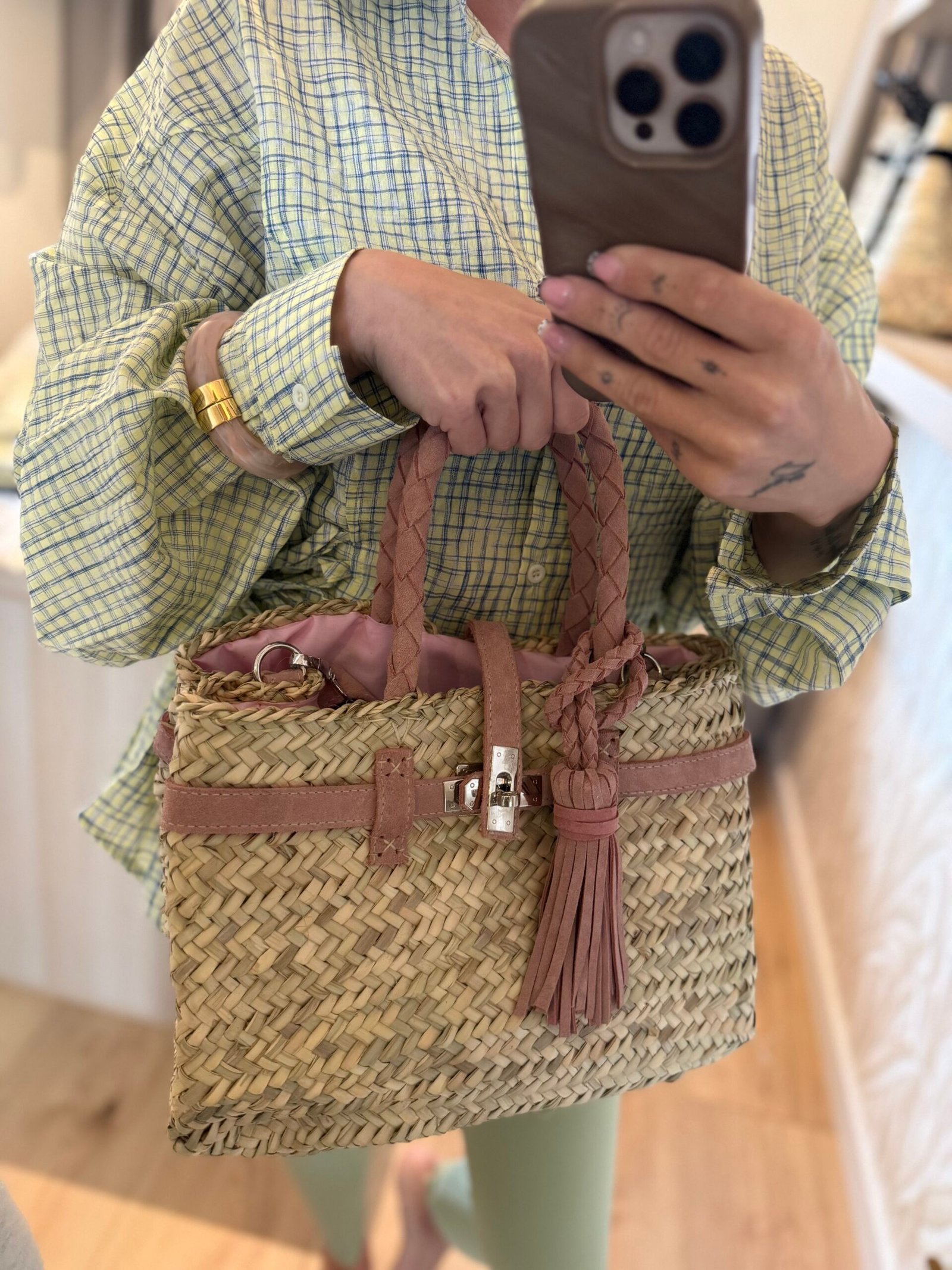By M rieten tas met suède licht roze