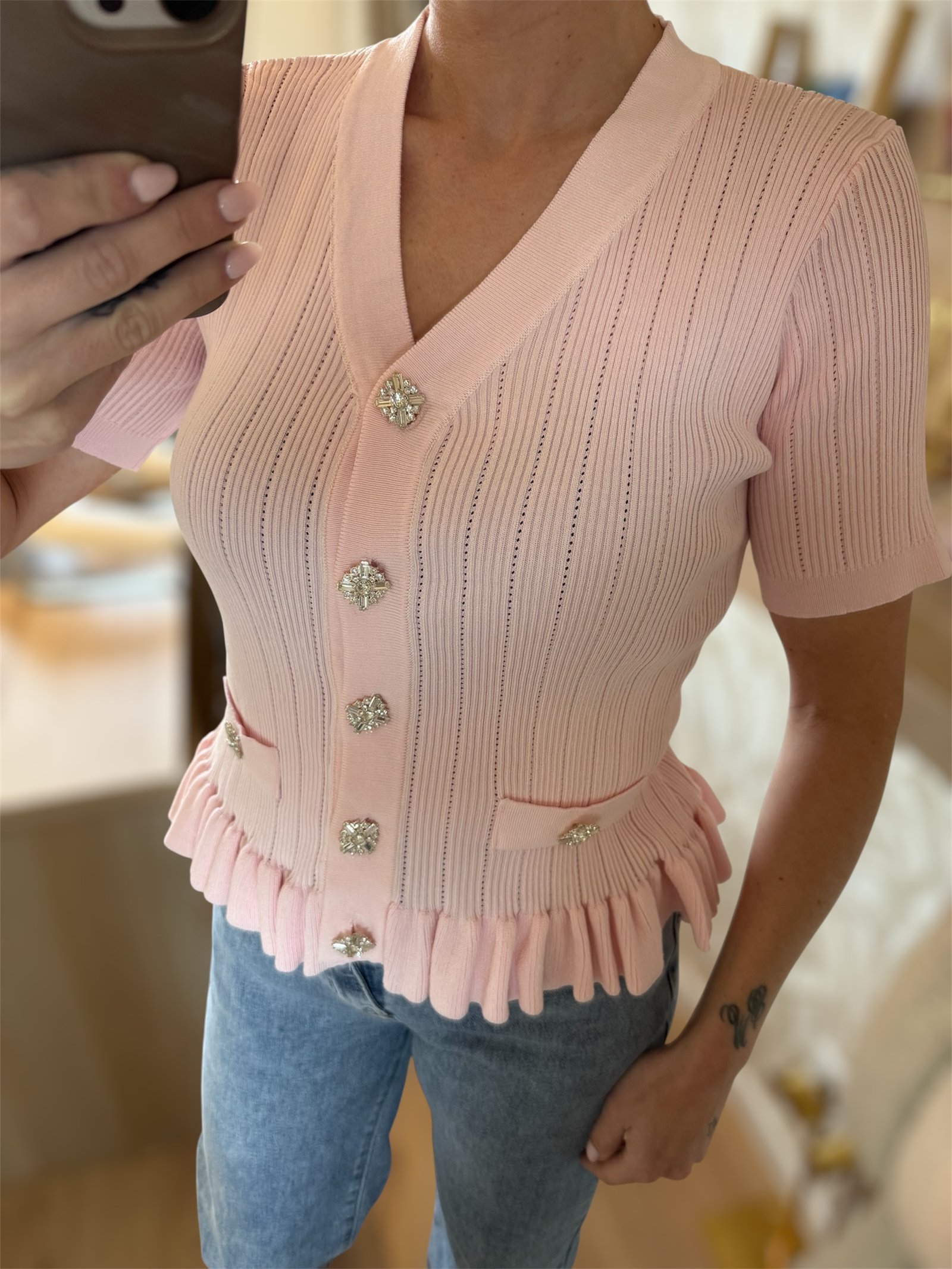 Licht roze met strass knopen, past perfect overal bij.