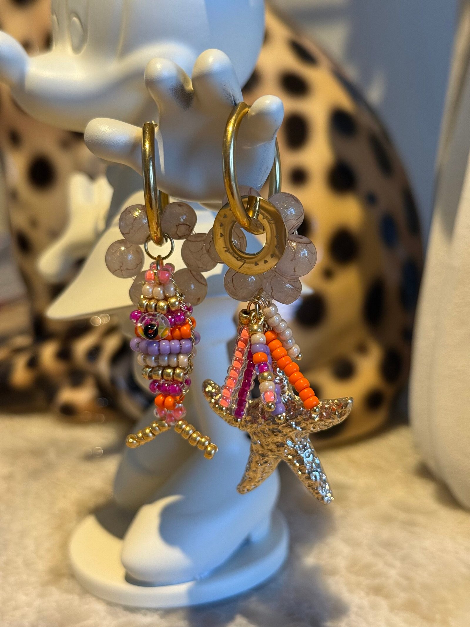Handgemaakte oorbellen, met verschillende bedels eraan.